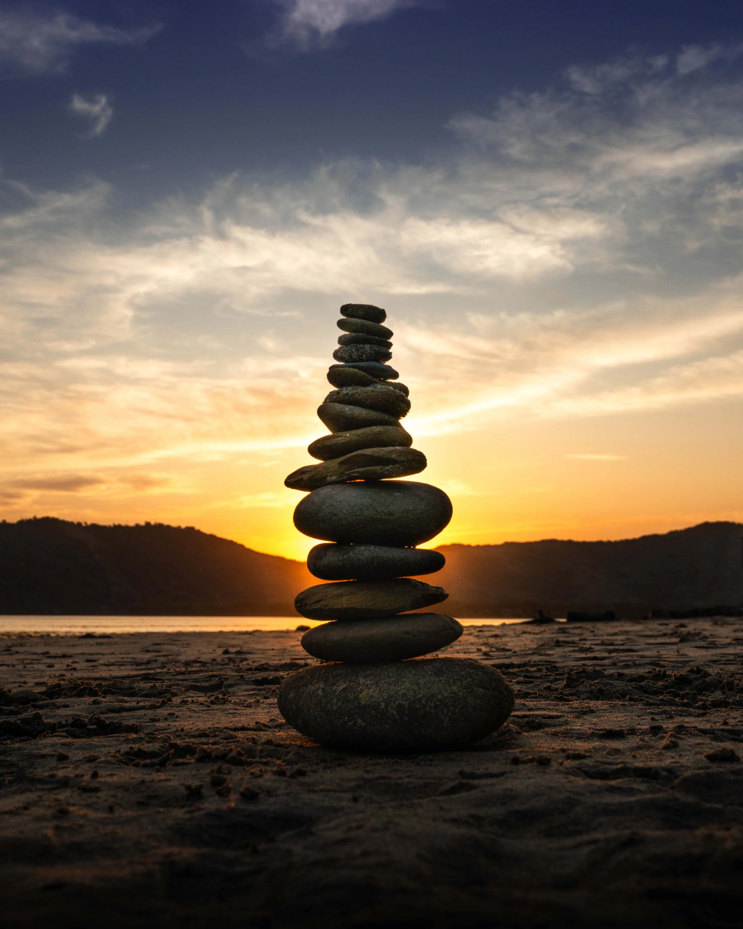 Stacked smooth stones balanced on a sandy beach at sunset with a river and mountains in the background.