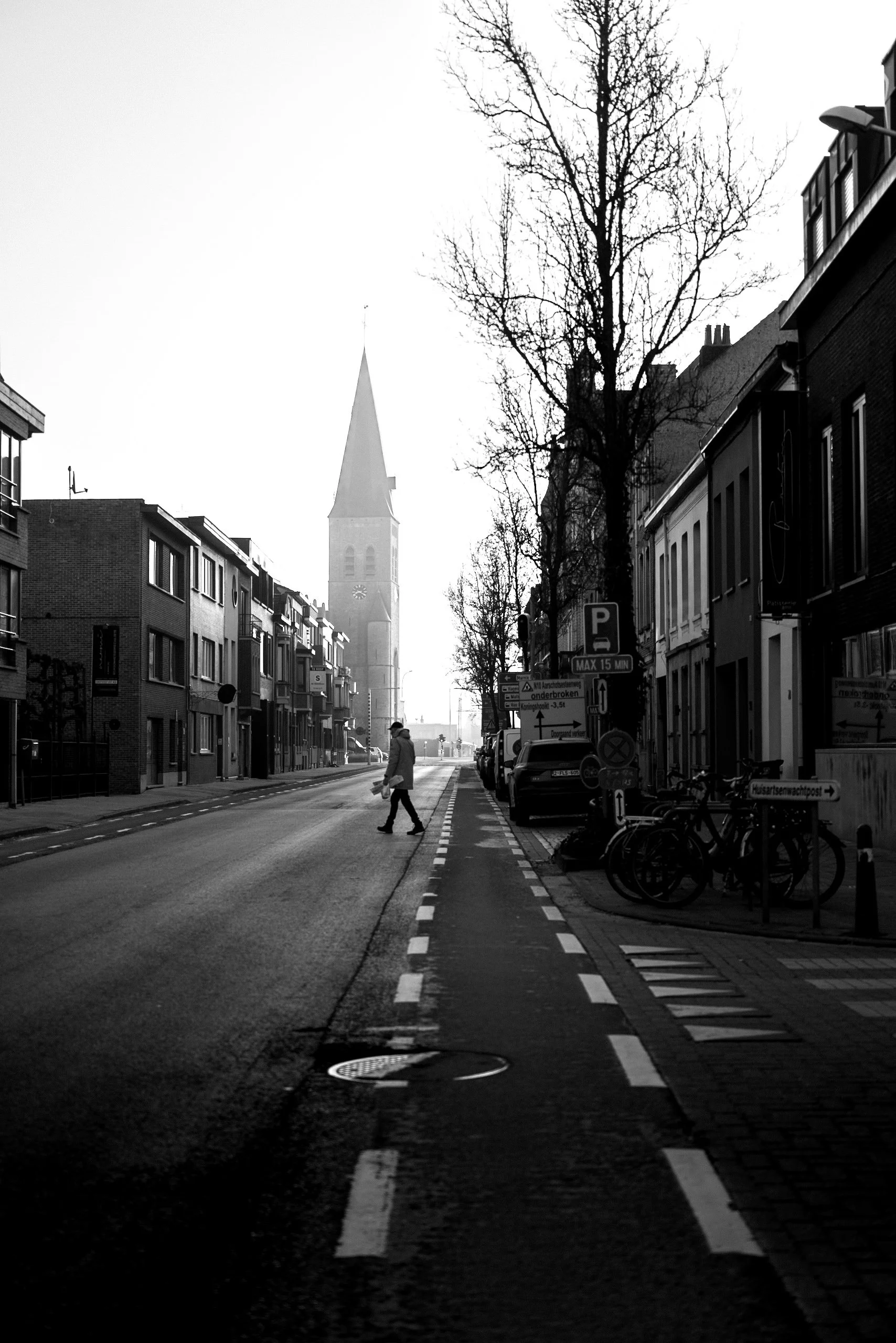 Black and white photo of a quiet city street with a person crossing and a church steeple in the background, parked cars on the side, and bicycles near a signpost.