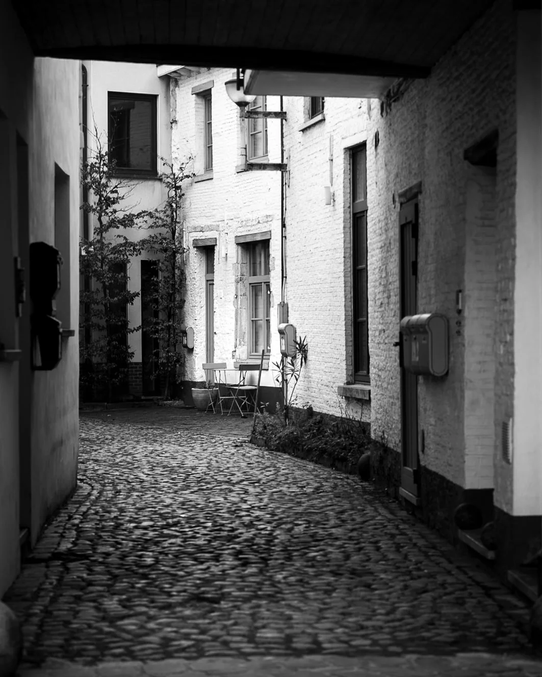A narrow, cobblestone alleyway between old brick buildings, with some outdoor furniture and plants visible.