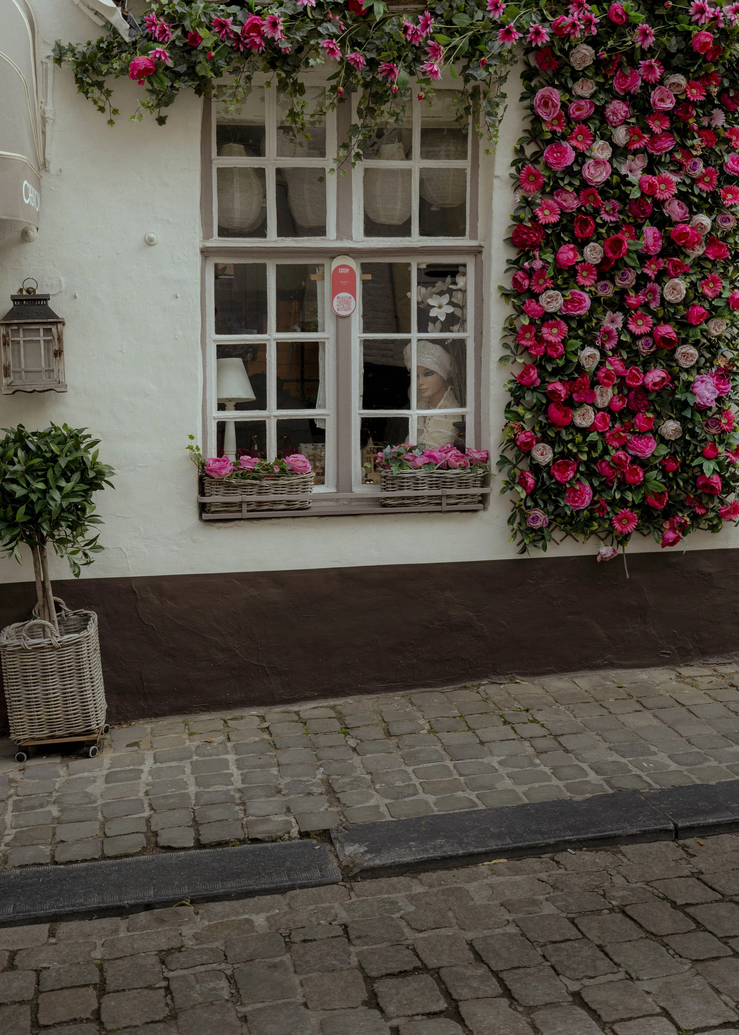 A quaint window display on a white brick building with an assortment of pink and purple flowers, including roses and daisies, climbing on the wall. Inside the window, there's a mannequin wearing a hat, a lamp, and other decorative items. The scratch-coated cobblestone street outside adds to the charming scene.