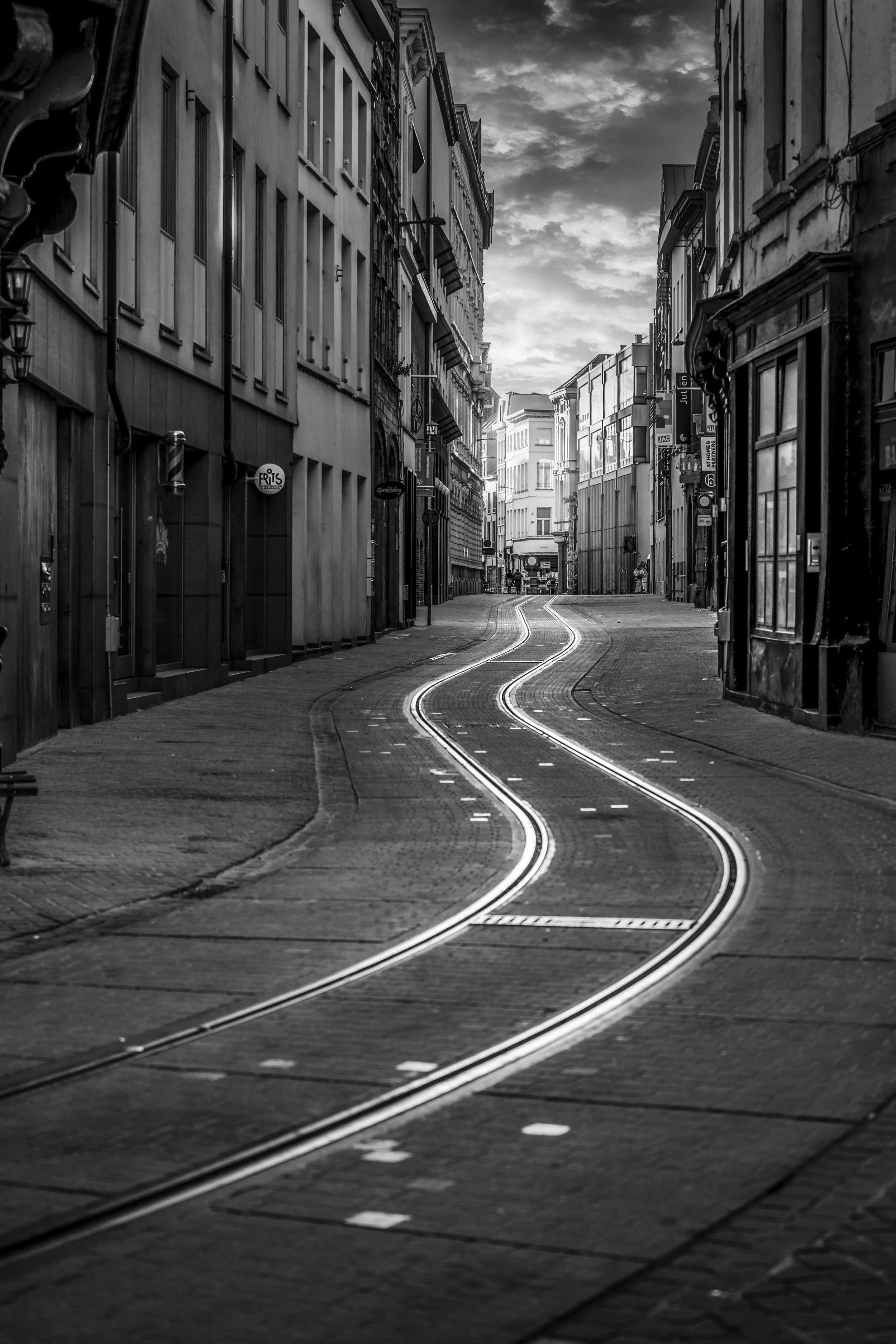 A black-and-white photo of a narrow city street with tram tracks running down the center, flanked by tall buildings with a cloudy sky overhead.
